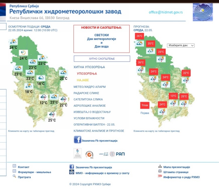 Републички хидрометеоролошки завод упозорио је на временске непогоде на подручју Србије данас и сутра 22. и 23. маја. Пљускови и грмљавине на подручју Србије очекују се после подне и увече локално ће бити праћени: градом, олујним ветром у зони пљуска и великом количином падавина за кратко време, од 20 до 40 mm, понегде и више. На подручју Крагујевца и Шумадије за сада нема проблема, стрелци су послати на противградне станице и припадници УВС су у стању приправности, казао је Зоран Кочовић, начелник Управе за ванредне ситуације Крагујевац.