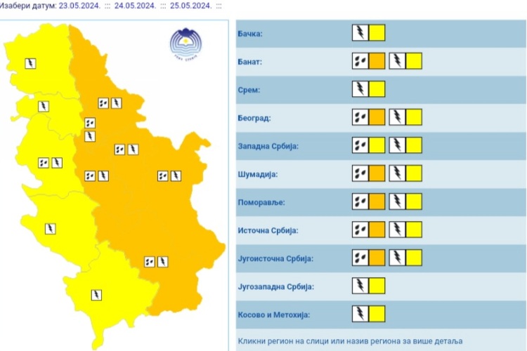 На подручју Шумадије, према подацима Републичког ходрометеоролошког завода, на снази је наранџасти метео аларм, што значи да прогнозиране временске појаве могу својим интензитетом да проузрокују штету.
