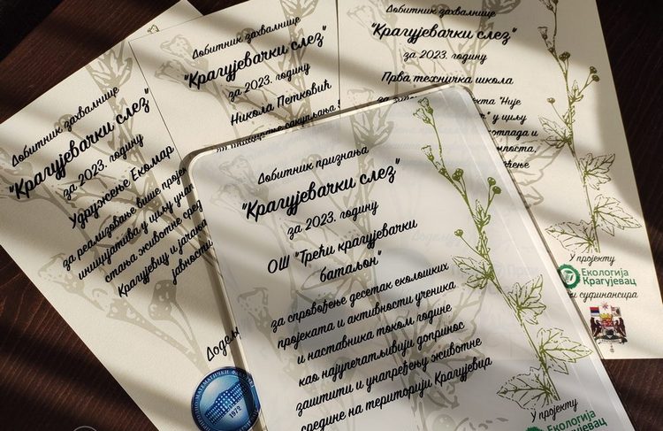 У Ботаничкој башти Природно-математичког факултета Универзитета у Крагујевцу данас су додељене повеља и захвалнице "Крагујевачки слез" – годишња признања за најупечатљивији допринос заштити и унапређењу животне средине на територији Крагујевца у 2023. години.