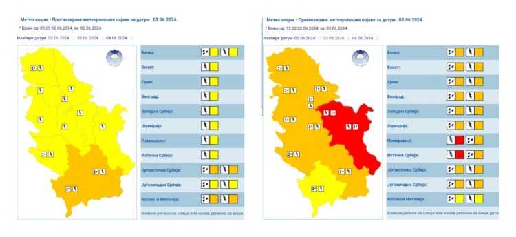 Републички хидрометеоролошки завод Србије упозорава наранџастим метео алармом на грмљавинске непогоде са пљусковима, данас послеподне и увече и то за подручја Расинског, Нишавског, Топличког, Пиротског, Јабланичког и Пчињског управног округа, док је за понедељак 3. јун црвени метео аларм предвиђен за Поморавски, Подунавски, Браничевски, Борски и Зајечарски управни округ. У свим осталим управним окрузима у понедељак се предвиђа наранџасти метеоаларм.