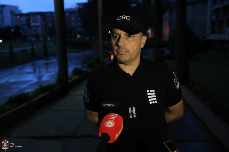 Управа за ванредне ситуације Крагујевац заједно са припадницима јавно – комуналних предузећа због ранијих упозорења Републичког хидрометеоролошког завода 96 сати је у стању приправности. Јако невреме праћено јаким градом величине ораха погодило је територију општина Аранђеловац и Топола, и града Крагујевца са приградским и сеоским насељима. Током поподневних сати радарски центри Бешњаја и Букуља деловали су са својих противградних станица и испаљено је преко 200 ракета у градоносне облаке, рекао је Зоран Кочовић начелник Управе за ванредне ситуације Крагујевац. Припадници Управе имали су само четири интервенције на терену а до изливања кишне канализације дошло је у насељима Пивара, Илићево и код Роде. Вода је највише направила проблеме на улицама града Крагујевца, док суграђани нису пријављивали поплаве у подрумском простору или стамбеним објектима. Стање је стабилно, вода се повукла и град нормално функционише. Снабдевање водом, струјом и гасом је нормално, рекао је Кочовић.