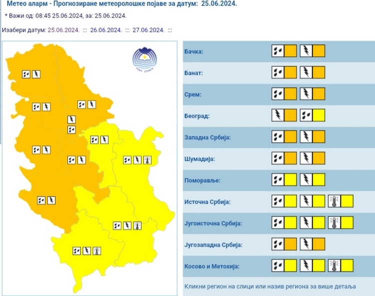 У уторак 25. јун 2024. наранџасто упозорење издато је за град Београд, Северно Бачки, Средње Банатски, Јужно Банатски, Сремски, Шумадијски, Колубарски, Мачвански, Златиборски, Моравички и Рашки округ, док се за среду 25. јун 2024. године наранџасти метеоаларм предвиђа за подручја: Северно Бачки, Западно Бачки, Јужно Бачки, Северно Банатски и Јужно Банатски управни округ.