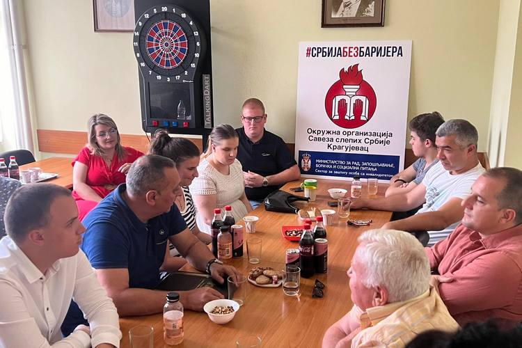 Окружну организацију Савеза слепих Србије у Крагујевцу посетили су представници Правног факултета Универзитета у Крагујевцу, продекан за наставу проф. др Срђан Ђорђевић, проф. др Зоран Јовановић и сарадник у настави и персонални асистент за наставу за особе са инвалидитетом Андрија Поповић, Сања Стојановић испред Удружења студената са хендикепом.