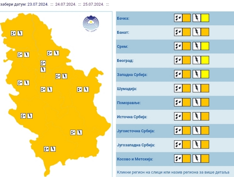 Републички хидрометеоролошки завод је за среду 24.07.2024. издао упозорење за подручје целе Републике Србије (наранџасти метеоаларм), на наоблачење и освежење са кишом, пљусковима и грмљавином. Очекује се веома нестабилно време са локалном појавом грмљавине, као и већом количином падавина за кратко време (од 20l/m2 у периоду до три сата). РХМЗ-а напомиње да је тачну локацију стварања, премештања јачине самих непогода унапред тешко одредити, а да ће хитна упозорења издавати 1 до 2 сата унапред.