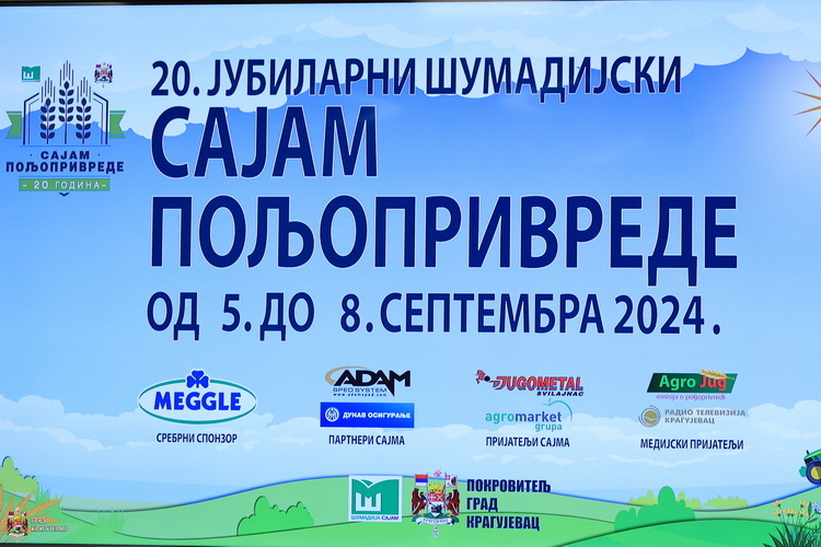 Александар Штајн, директор Шумадија сајма истакао је да ове године на Сајму пољопривреде имамо највећи број излагача, преко 100, међу којима су произвођачи и дистрибутери сточне хране, механизације, банке, представници институција које пружају подршку пољопривредним произвођачима. Поводом 20. година Сајма пољопривреде биће приређена изложба фотографија која представља ретроспективу развоја ове најстарије сајамске манифестације у Крагујевцу. У оквиру пратећег програма, у петак, 6. септембра, са почетком у 20 сати биће одржан концерт Радише Урошевића, а улаз ће бити слободан.