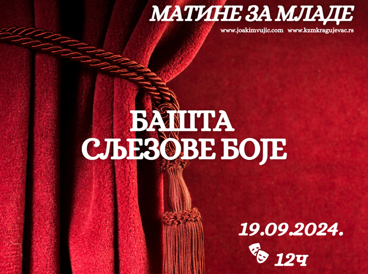Канцеларија за младе града Крагујевца и Књажевско-српски театар и ове сезоне настављају успешну сарадњу кроз програм Матине за младе, чији је циљ да их упозна са богатством позоришне уметности, развију интересовања, креативност и стичу навике одласка у позориште.