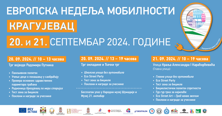 Крагујевац је један од 36 градова и општина из Србије који се прикључио обележавању Европскe недељe мобилности а чија је тема ове године „Заједнички јавни простори“. Циљ акције ЕНМ која се од 16. до 22. септембра обележава у 2000 хиљаде градова из 44 земље је побољшање квалитета живота у градовима, промовисањe инфраструктуре у служби грађана, стварањe услова за активне мобилности и олакшавање употребе чистијих начина превоза, а пре свега активирање грађана да заједно преобликују и унапреде јавне просторе.